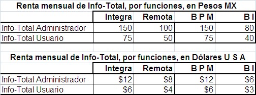Info-Total tiene 2 versiones: libre y pago, y cada versión incluye dos programas: Info-Total Administrador, para diseñar y ejecutar las funciones, e Info-Total Usuario, que solo las ejecuta.