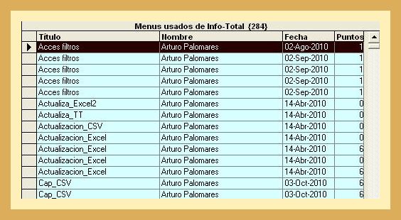 Info-Total proporciona reportes de su uso , con objeto de conocer quién, cuando y para que se usa.    Algunos reporte son detallados, informándole de cada uso de Info-Total;  puede seleccionarlos por fecha, usuario, menú usado y varios otros datos.   También podrá imprimir el reporte y exportarlo a un archivo que puede manejar con Excel.   Otros son estadísticos, para permitirle una revisión rápida en cuadros y gráficas estadísticas.